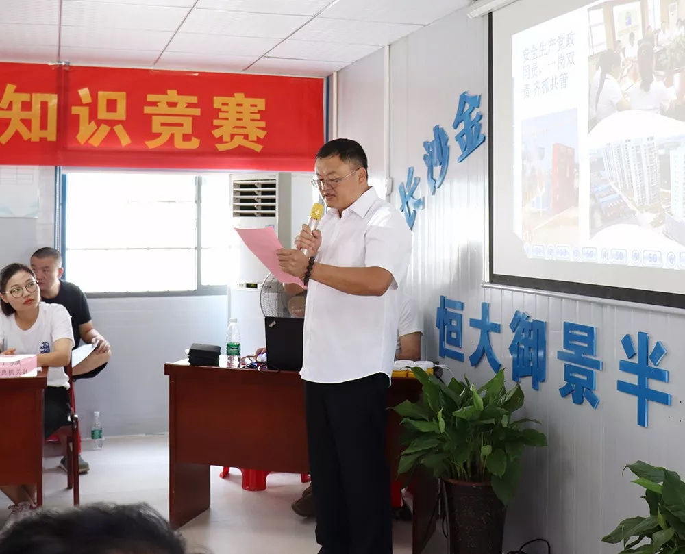 為進(jìn)一步延伸“安全生產(chǎn)月”活動(dòng),全面貫徹黨的十九大精神,積極響應(yīng)習(xí)近平總書(shū)記對(duì)安全工作的重要指示和省、市關(guān)于安全生產(chǎn)的決策部署,在公司掀起安全生產(chǎn)學(xué)習(xí)熱潮,營(yíng)造濃厚的安全生產(chǎn)氛圍。在建黨97周年之際,公司安全生產(chǎn)月活動(dòng)之時(shí),以公司黨員帶領(lǐng)全體員工開(kāi)展以“生命至上、安全發(fā)展”為主題的安全生產(chǎn)知識(shí)競(jìng)賽在恒大御景半島項(xiàng)目部會(huì)議室隆重舉行。