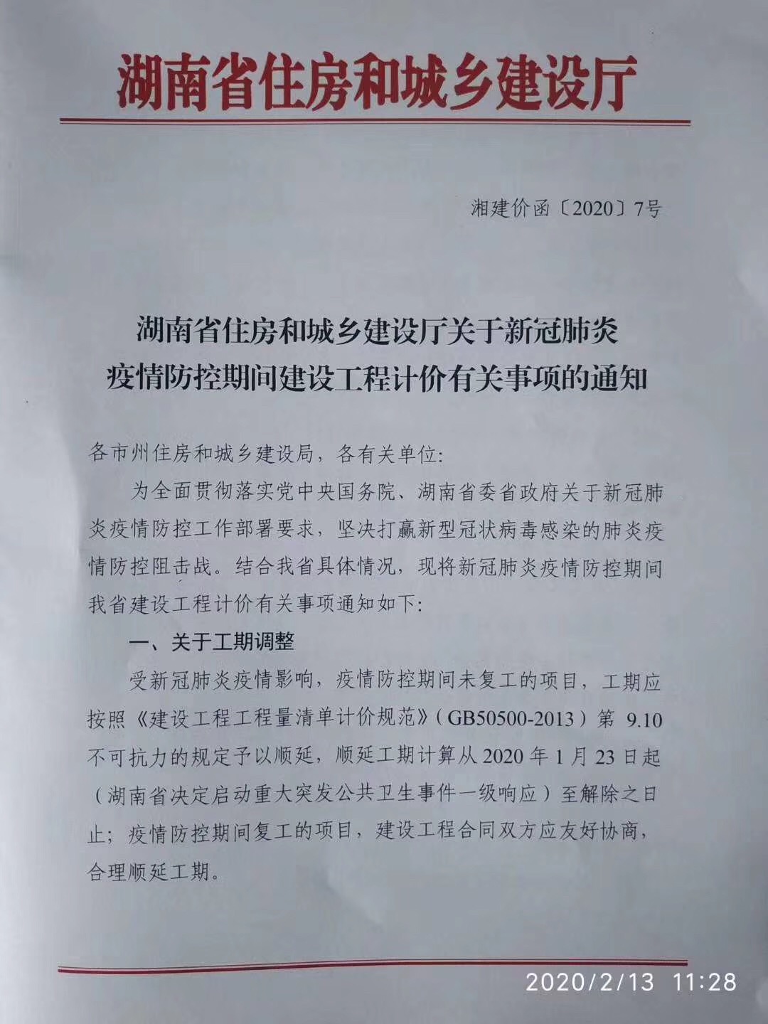 湖南省住房和城鄉(xiāng)建設(shè)廳關(guān)于新冠肺炎疫情防控期間工程計(jì)價(jià)有關(guān)事項(xiàng)的通知